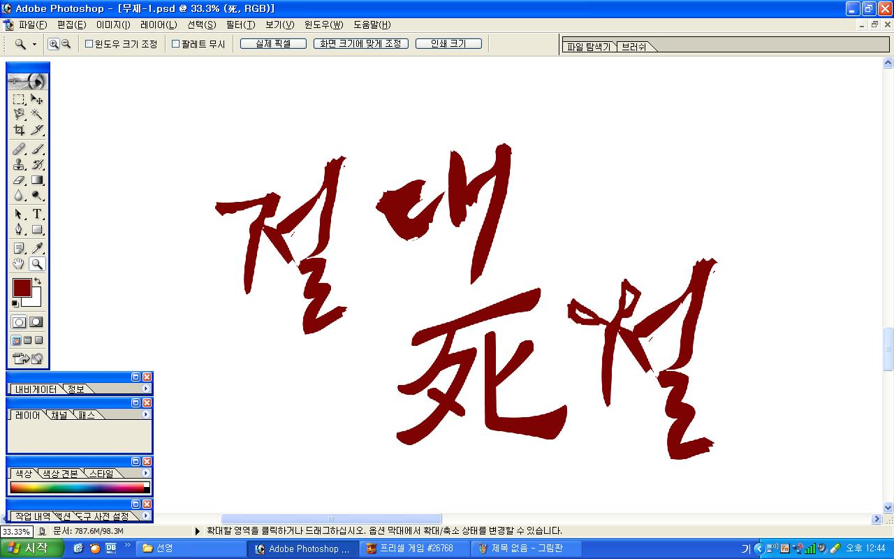 정중히 캘리 부탁드립니다. -_- 류재철 일반 0 5548 2009.11.16 11:18 실력자 분들이 많이 계셔서 이렇게 염치없게 부탁드립니다. - 절대死절 : 첨부한 파일 참고해주시면 감사하겠습니다.(약간 거친느낌? ^^;;) : '절'자의 ㅈ은 가위로...^^;; : 포스터 제작용이라 ai 파일이 필요합니다. 대학동아리 연극공연 포스터로 쓸 예정입니다. 비상업적인 공연이라 이렇게 부탁드립니다.